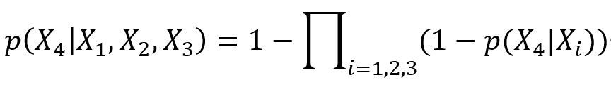 在贝叶斯网络中,若多个父变量均可单独对子变量产生概率影响,则称这些父节点是相互因果独立的。在因果独立的情况下,称贝叶斯网络模型为Noisy-Or模型,其中各节点的父节点之间都因果独立。若子变量X4有且仅有三个相互因果独立的父节点X1,X2,X3,则有节点X4发生的条件概率: