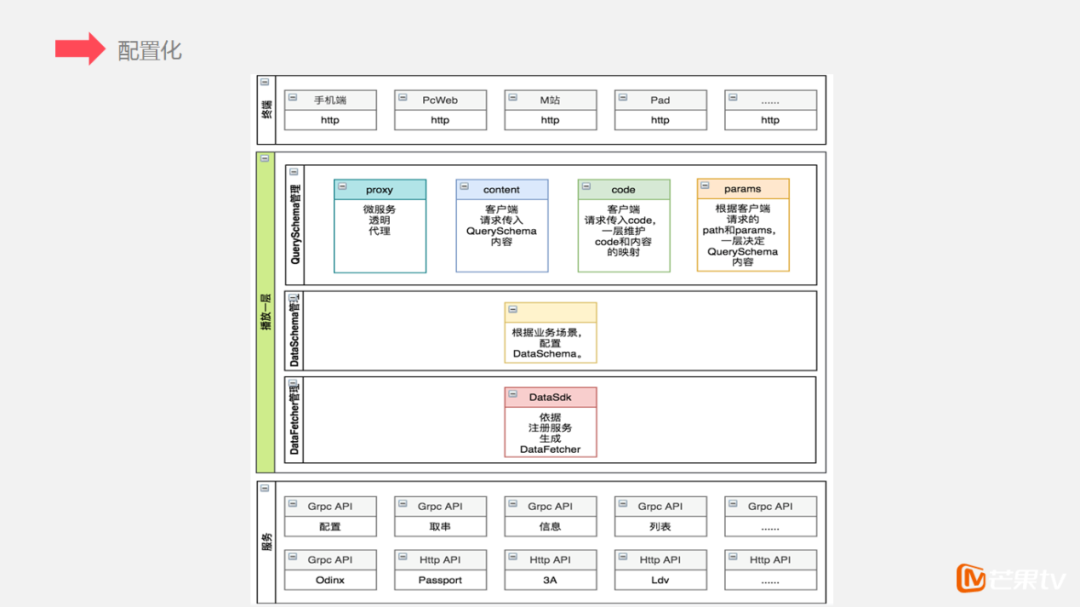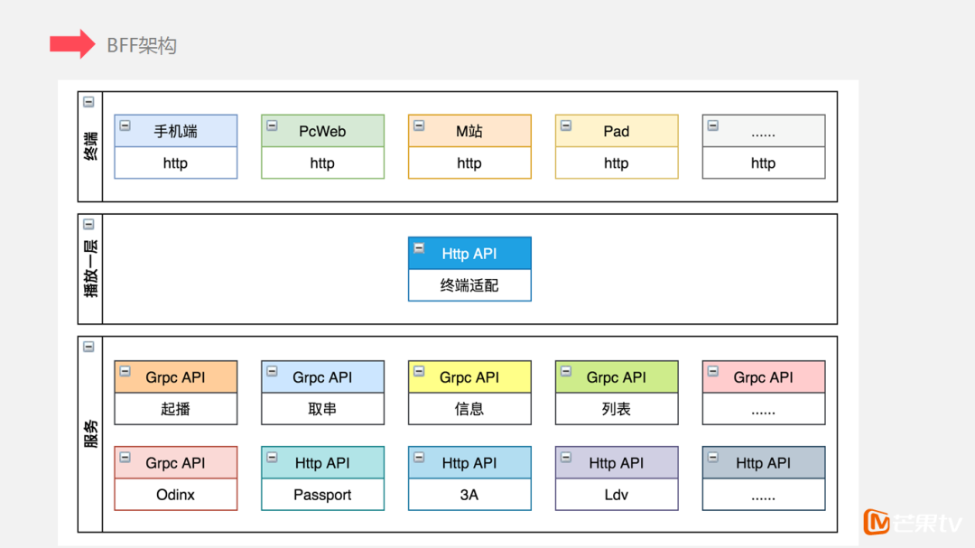 那么,要解决播放一层的问题,芒果TV希望BFF架构做到以下几点。首先是明确定位,明确终端、播放一层和服务层的职责,最主要是搞清楚中间层:播放一层的定位。其次是终端适配,需要一种方便、标准的方式实现多端差异化需求适配。最后是服务化,播放一层合并的过程中抽象出通用业务可以下沉为服务。“这样下来,新的架构很容易就出来了。”易桂说。