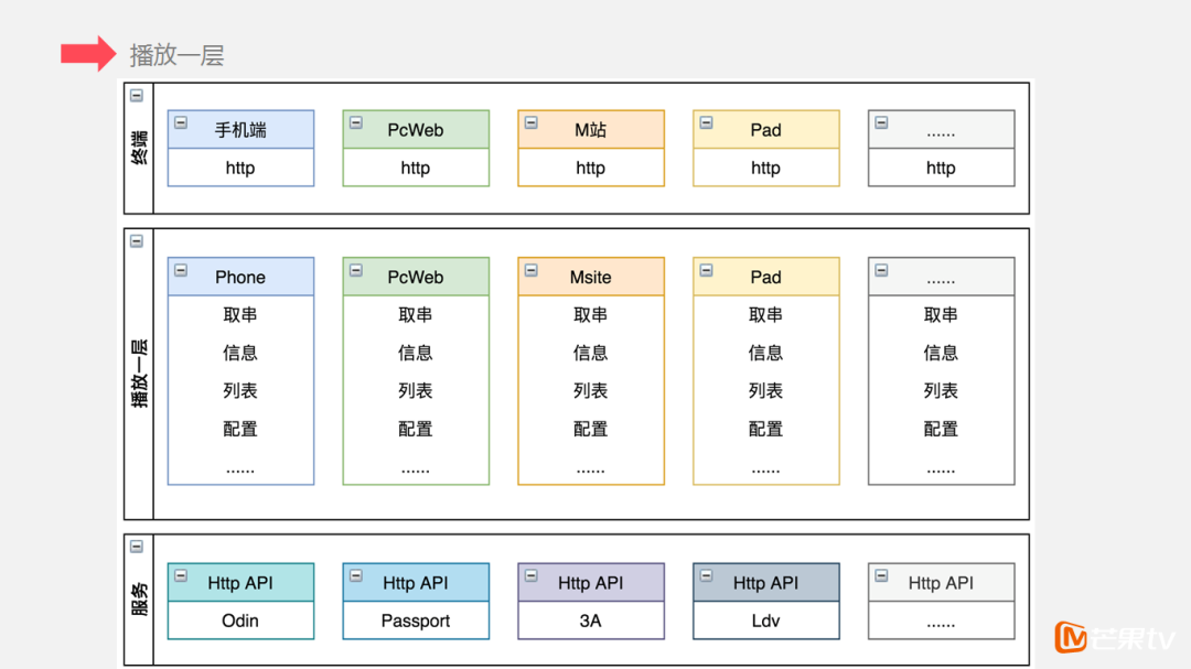 首先是对芒果TV的播放一层业务和技术架构的发展,易桂介绍了播放一层的前世今生。播放一层负责客户端点、直播功能的后端业务逻辑,是直接面向终端的,所以叫我们一层。芒果TV从最开始的PcWeb端,逐步发展为拥有M站、手机、Pad等客户端,由于我们早期是按照终端来做产品的,这也间接决定了播放一层之前的架构如此。各个终端发起http请求到自己对应的播放一层,各端播放一层再请求下游http服务接口获取数据,进行业务逻辑处理。各端播放一层都包含播放的全部业务,且各端播放业务大体相似,抽象的说有取串、播放页信息、诸多列表和很多配置接口。
