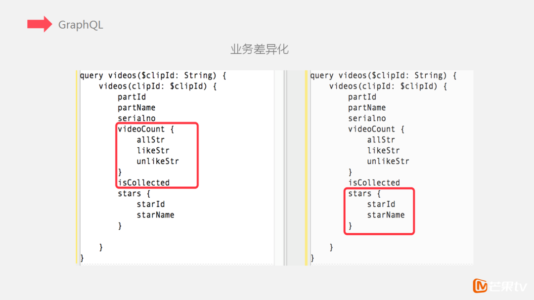 易桂表示,经过调研之后,选中了GraphQL,一种为API而生的高性能查询语言。GraphQL 作为一种 API 查询语言,专门用于处理已有服务接口的响应结果,已被Facebook、Netflix、GitHub使用。易桂举例介绍道:“一个获取视频信息的接口,GraphQL分为服务端描述数据部分,我们在播放一层定义了Video类型数据,有vid,videoName和serialno字段。同时GraphQL会把描述的数据与后端微服务接口做关联,指定哪个服务的哪个接口返回Video类型数据。客户端按需求请求播放一层定义的Video类型数据,例如获取vid为10000的视频,且只需要videoName字段。此时播放一层给客户端的响应内容就只有视频名称信息。”