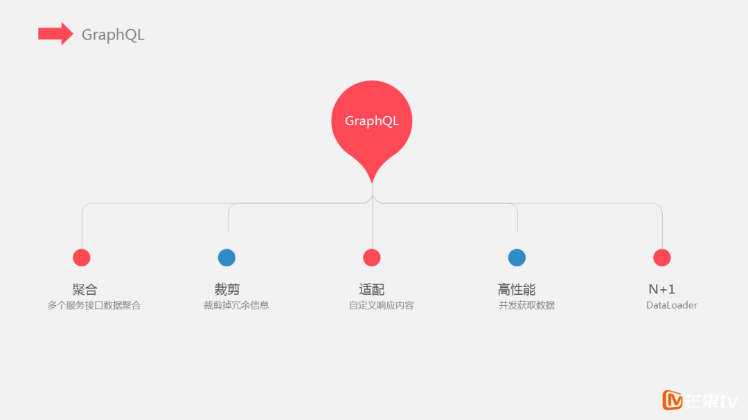 随后易桂介绍:“以上就是对GraphQL的初步了解,那么GraphQL是如何做到聚合的?是通过多个服务接口数据聚合、裁剪掉冗余信息、自定义响应内容,以及GraphQL的高性能,即并发获取数据和N+1问题的解决方案DataLoader等。”