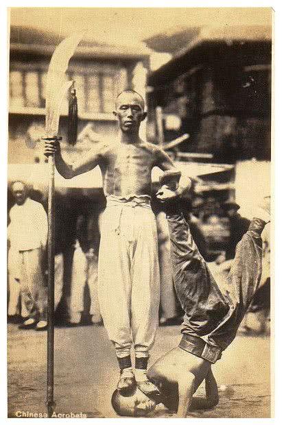 在清朝北京城街头玩杂技的民间艺人,这种杂技今天大家还是不要玩的好,很危险的!