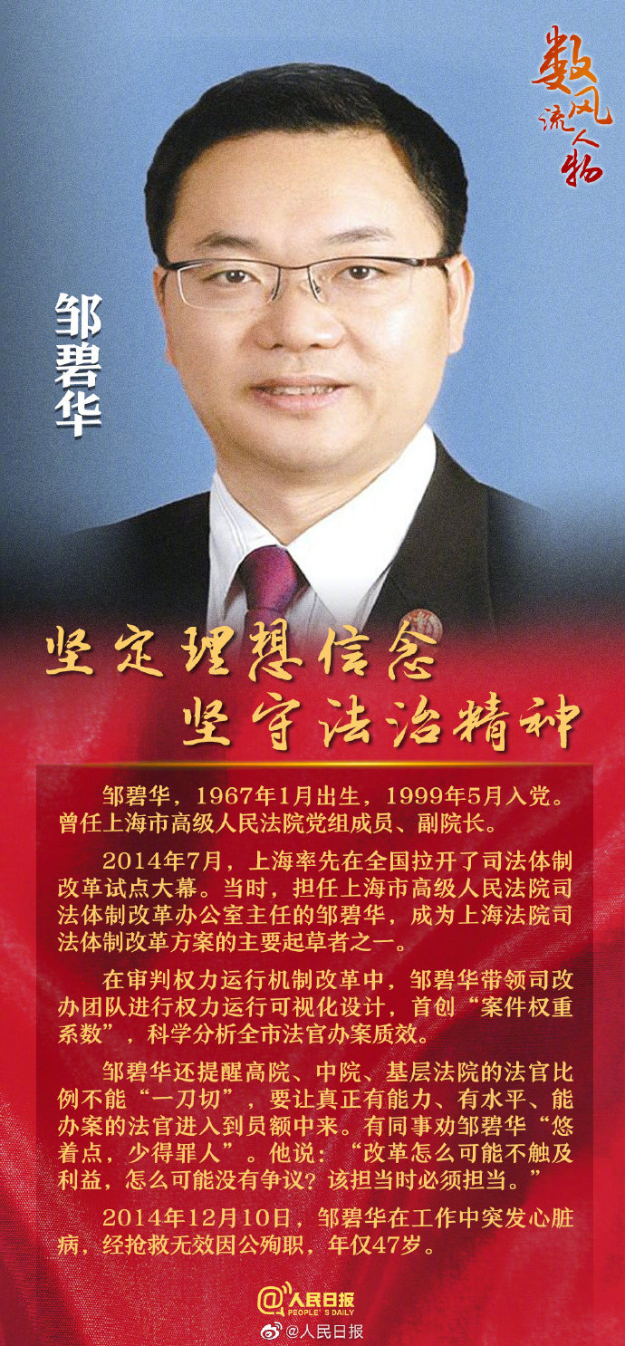 邹碧华在上海法院系统工作26年,是上海法院司法体制改革方案的主要起草者之一。他首创“案件权重系数”,科学分析全市法官办案质效;他提醒高院、中院、基层法院的法官比例不能“一刀切”,要给一线法官更多机会。有同事劝邹碧华“悠着点,少得罪人”。他说:“改革怎么可能不触及利益,怎么可能没有争议?该担当时必须担当