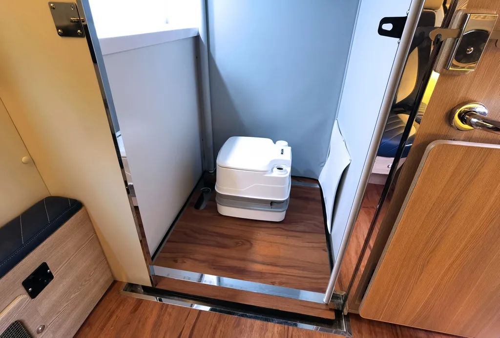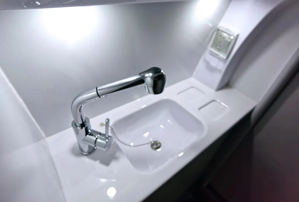 卫浴间配备了抽拉式淋浴花洒、洗手池、便携式马桶、吊柜和智能通风换气扇等。值得一提的是,便携式马桶可以从内或者从外两种方式取出,卫浴间区域也更易于清洁。尾部生活和休息区,途酷提供了两种布局。布局一: