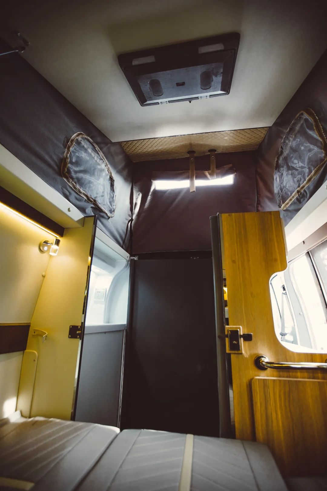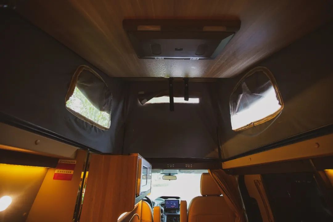 外观上最大的亮点在于升顶设计,打开顶棚后车辆的户外感极强,在露营区也是最惹眼的存在。得益于低顶底盘,顶棚收起状态下车身只有2006mm,看上去和普通商务车一般无二,进出大部分地下车库也是毫无压力,可以解决大部分房车会碰到的停车难的问题。