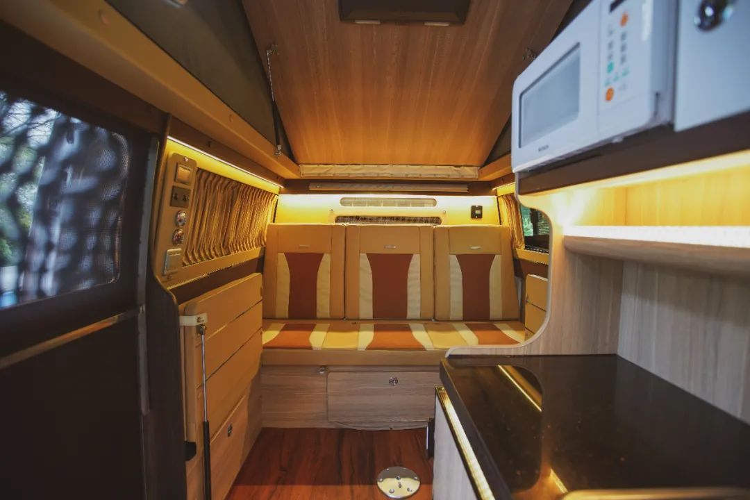 这款房车的布局不同于大多数B型房车,途酷又一次展示了他们把全顺“玩出花”的能力。内饰多处黄色灯带,也营造出了温馨舒适的氛围。