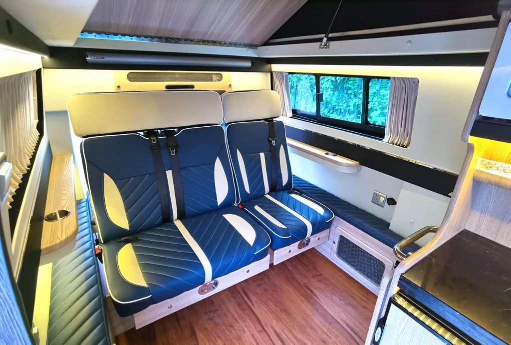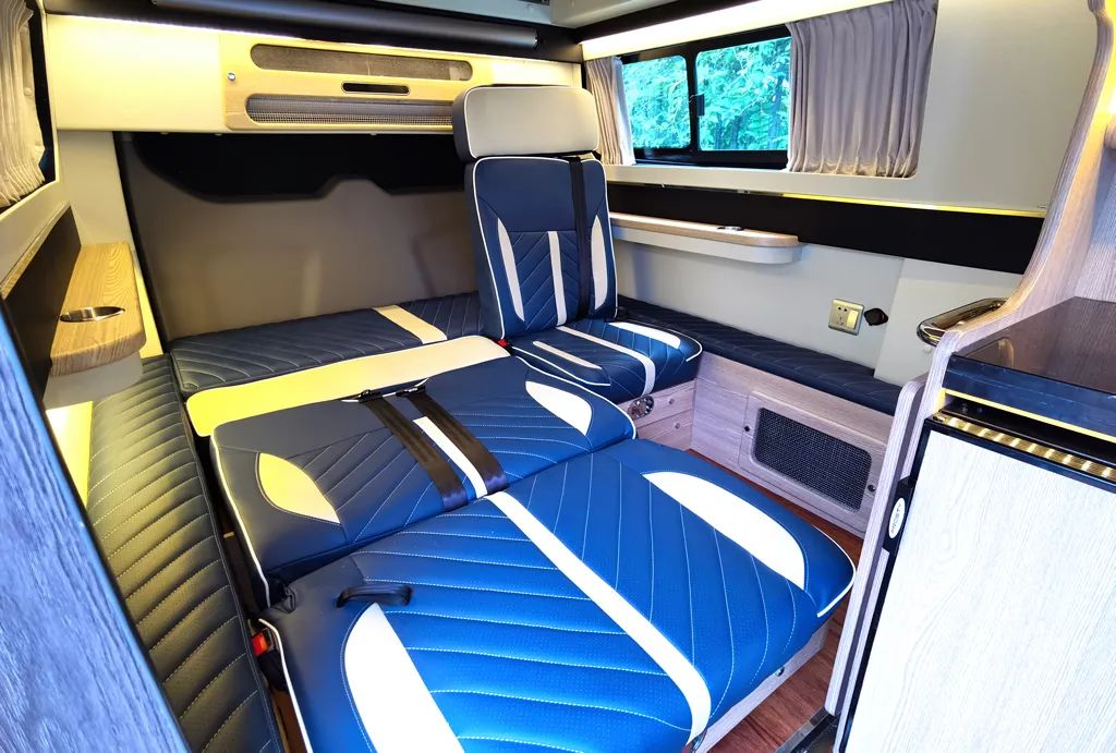 采用“2+1”的座椅设计,均采用真皮包裹。驻车时,可以根据需要在单人座椅+拼床、双人卡座+拼床和全拼床铺之间自由切换,最大的全铺床位尺寸可以达到1900×1700mm。