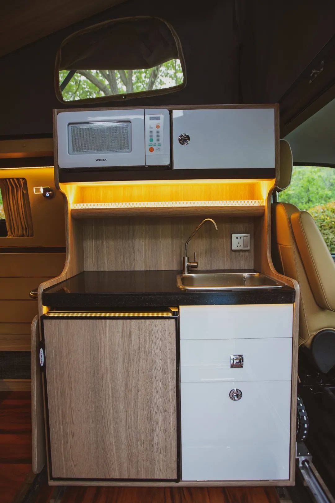 整体式厨房位于车厢中部左侧,配备了66L冰箱、220V微波炉、洗菜池、储物柜和五孔插座等,满足出行需求。
