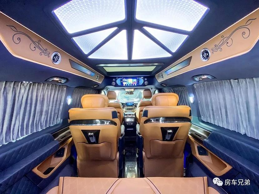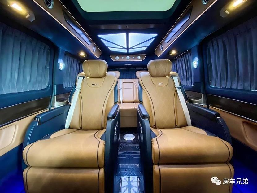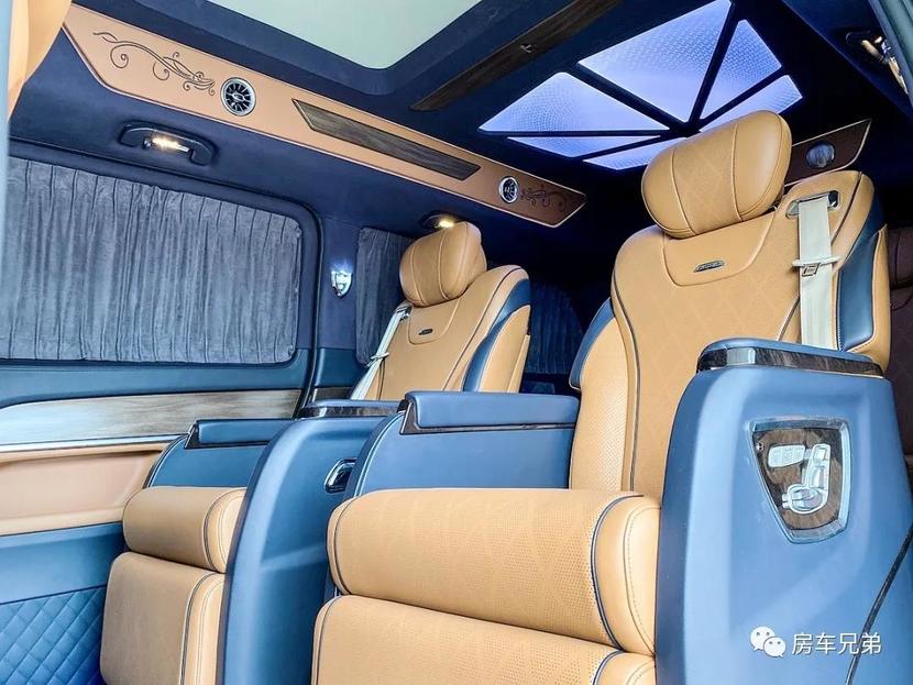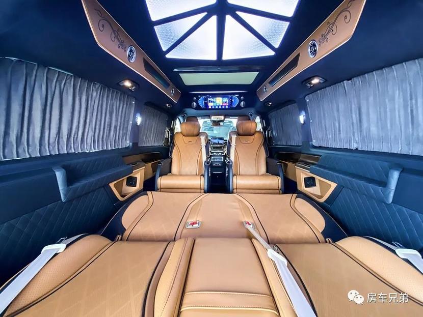 车身地板EO级奢华实木地板,车身顶部是六叶草钻石切割顶灯及全景天窗,辅以车内氛围灯,可谓是兼顾实用和浪漫功能。中后舱Nappa真皮航空座椅,具有通风、加热、按摩、可旋转等多种功能。户外途中,舒适与幸福,溢满心头。车身两侧双层绒布窗帘,搭配后排隐私玻璃,全方位照顾用户隐私,注重用户精神心理舒适体验。