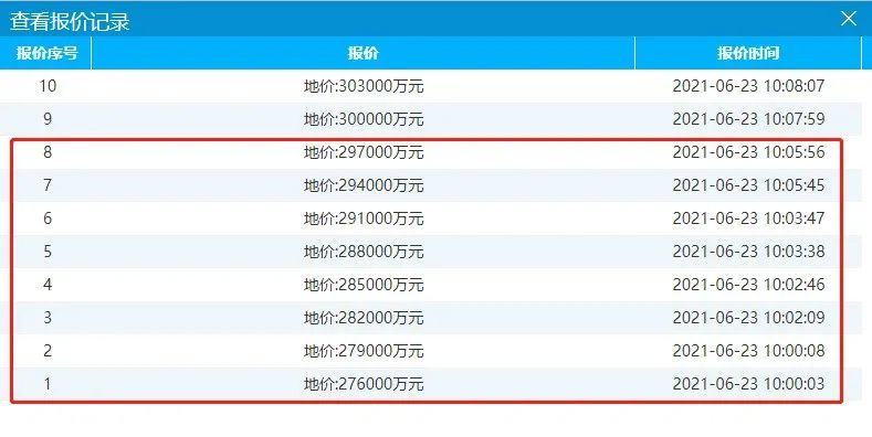 10:00 拍卖开始,参拍房企便开始密集报价,5分钟就达8轮报价。