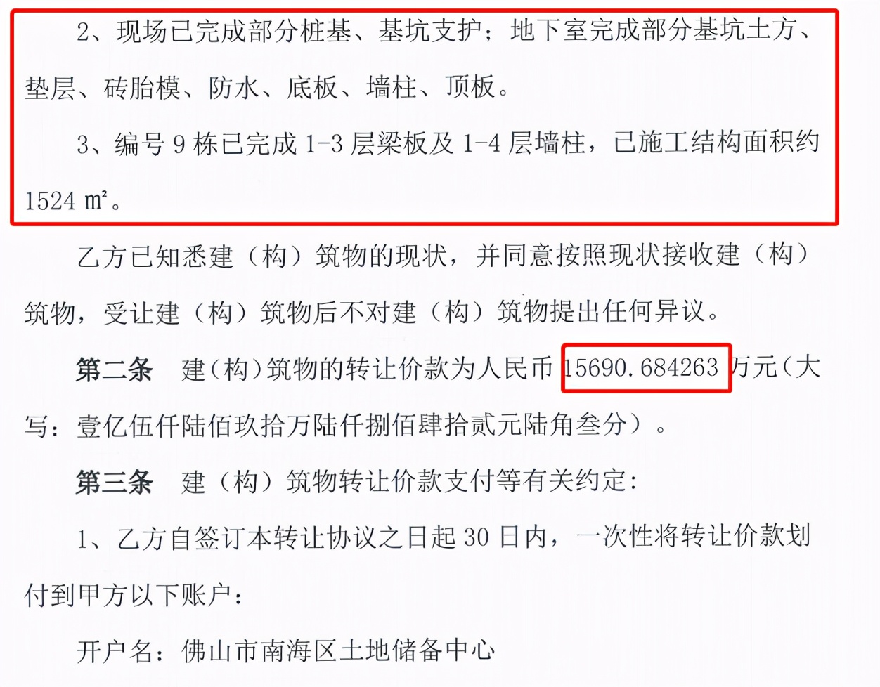 根据转让协议显示,建筑物的转让价款为人民币15690.684263万元,竞得人须转让予南海区土地储备中心。