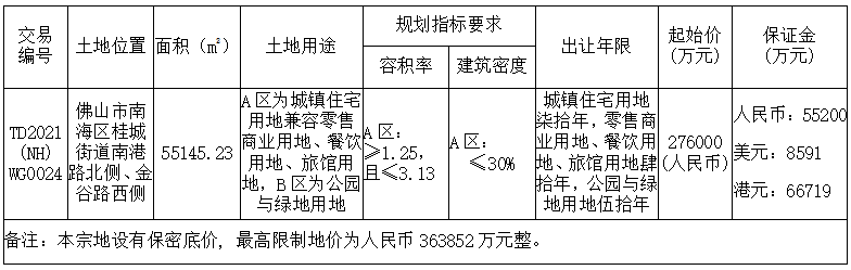根据出让文件显示,地块位于桂城街道南港路北侧、金谷路西侧,总占地面积55145.23㎡,分A/B区开发,其中A区规划为商住用地,占地52839.29㎡,容积率≤3.13,绿地率≥30%,建筑密度≤30%;最高计容建面为165387㎡。