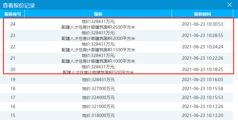 10:18 竞人才配建开始,报价开始变缓,约2分钟报出一轮。