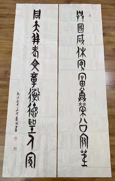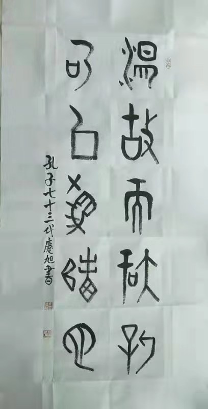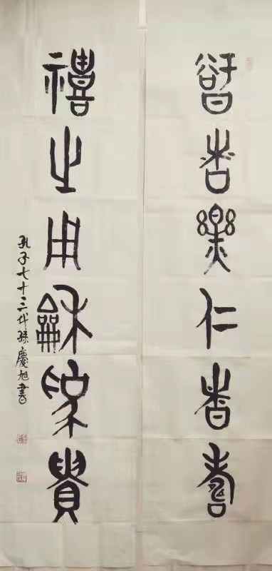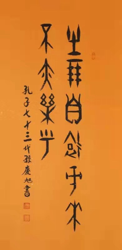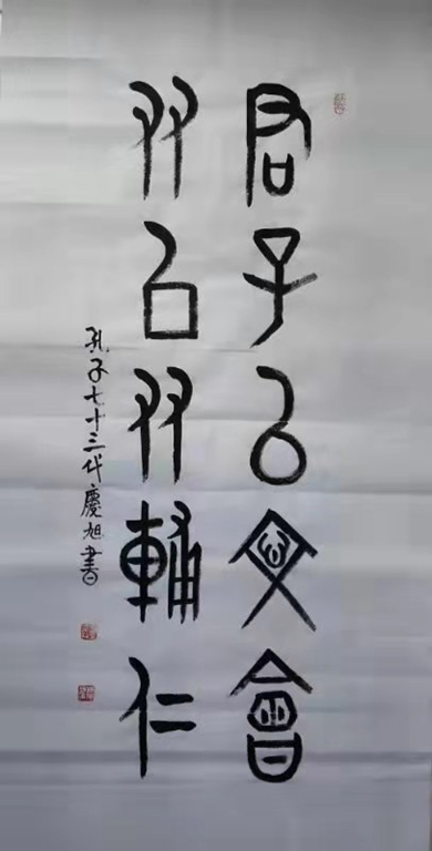 孔庆旭先生出身于书香门第,儒教世家,自幼深受家庭熏陶,习读先祖孔子论语、史书。擅长甲骨文、金文、楷书书法研究,追古溯源,其书风潇洒飘逸,灵活多姿,用笔遒劲,刚柔相济,古朴率真,格调清雅,独俱神韵。研学工笔国画,塑造先祖孔子重彩画像,画面先祖形象神采奕奕。现为文化旅游部国家一级美术师,中国文化传播大使,国家一级书法师,作品编入《纪念孔子诞辰中国国际书画大展作品集》。2020年经文化和旅游部文化艺术评定中心严格审核,国画作品通过了ISC艺术品价值标准评定,国内市场作品润格为每平方尺36000元人民币。