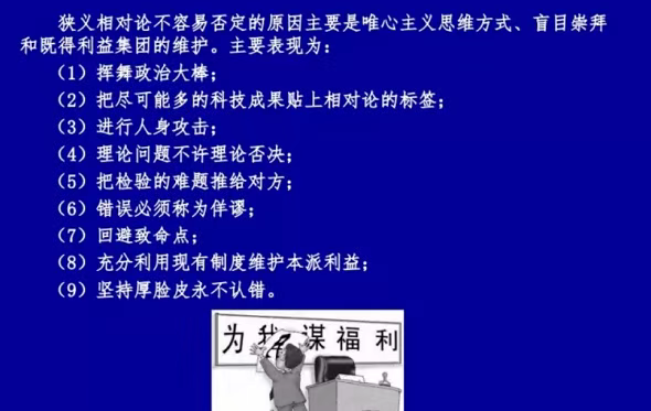 ▲李子丰在PPT中将狭义相对论不被否定的原因归结为唯心主义思维方式。图/李子丰PPT截图