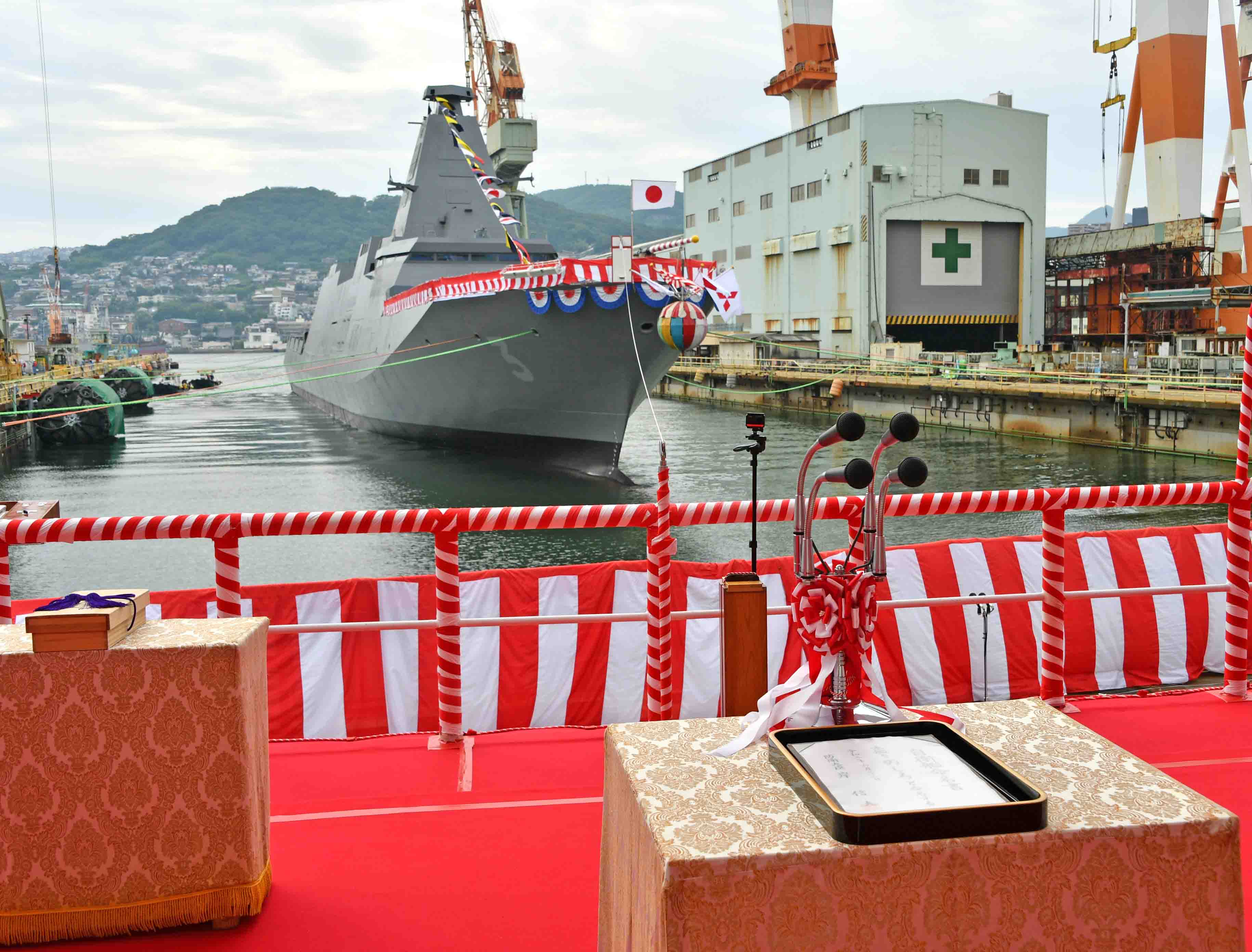 (观察者网讯)据日本海上自卫队消息,6月22日,日本新型护卫舰30FFM(“最上”级)三号舰在三菱长崎造船厂下水,命名为“のしろ”(能代)号。