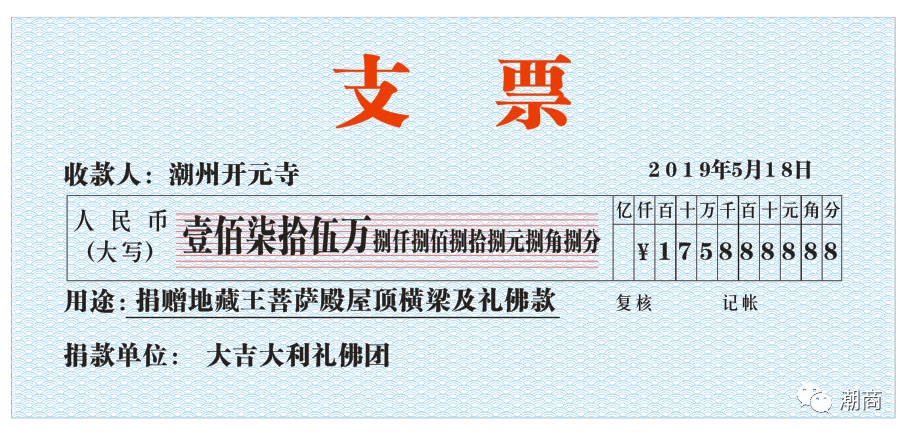 2019年5月18日,陈健辉组织大家捐赠善款共计人民币1758888元,给潮州开元寺。