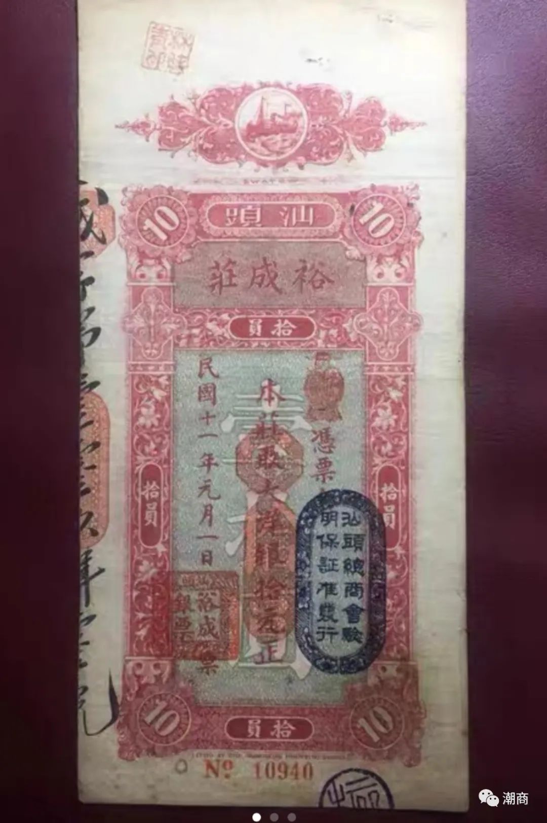 这是一张记录着汕头陈氏家族曾经的辉煌及其发展历程的票券。汕头自1860年开埠后,私人汇兑庄逐渐成为本区域最重要的金融机构,家族银庄也逐渐扩大和集中,至1930年前后,众多的潮阳帮大银庄,都为潮阳县溪东陈氏家族族人所控制。各银庄通过宗族或姻亲等关系为纽带,相互监督,使其信誉得到了充分的保证。除本券裕成庄外,陈氏家族更大的银号有宝盛、源大等, 还有:陈玉亭(17世)开设的阜丰庄、德成庄,陈世霖(18世)开设的春成庄、陶成庄等等,俗称“成”字票。裕成庄,为该家族人陈炽临(19世又有写成陈炽林)所开设。
