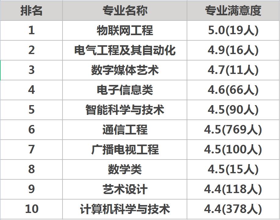 根据相关网站的统计,通过对重庆邮电大学各个专业的办学条件、教学质量、就业情况等方面进行了综合调查,最后得出了对应的专业满意度排名,如下图所示。由于该统计的样本数量较少,仅可作为参考。