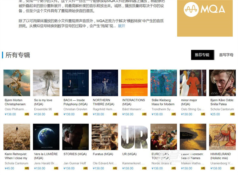 目前,国内能获取的MQA音乐的途径主要是网络音乐下载和唱片。对于网络音乐下载,索尼音乐精选网站上面就有2L公司的MQA音乐下载,专辑一律138元人民币,其他无损格式、DSD音乐的价格浮动在100〜300元范围,少数合集类的音乐就更贵,而MQA音乐在总体价格方面还是偏高的。但站在音响发烧友的角度,他们手上都有很多大量容量硬盘,甚至自己组建一个用硬盘阵列组成的NAS,都会使用FLAC、WAV、DSD音乐文档,似乎不太在乎那么一丁点的空间。相反,MQA对手机、平板用户的意义更大一些,毕竟这些移动设备的内存不大,MQA在文件体积和音质方面的优势得以体现。