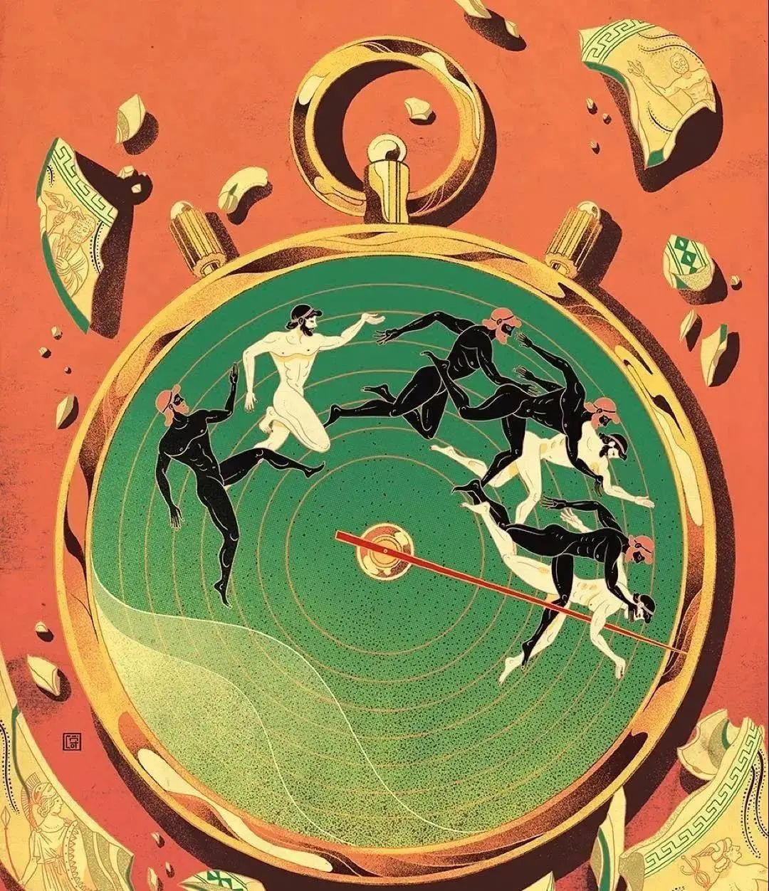 它有很多细节,破碎的钟盖、古希腊风格的图案,以及看着很眼熟但不敢确定身份的奔跑者。