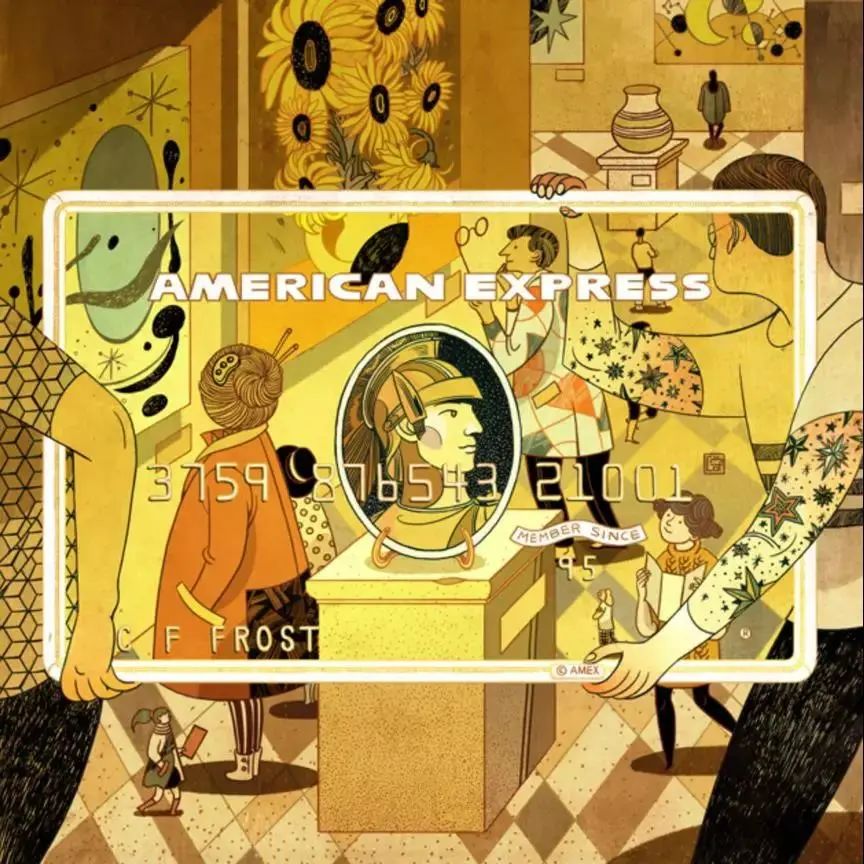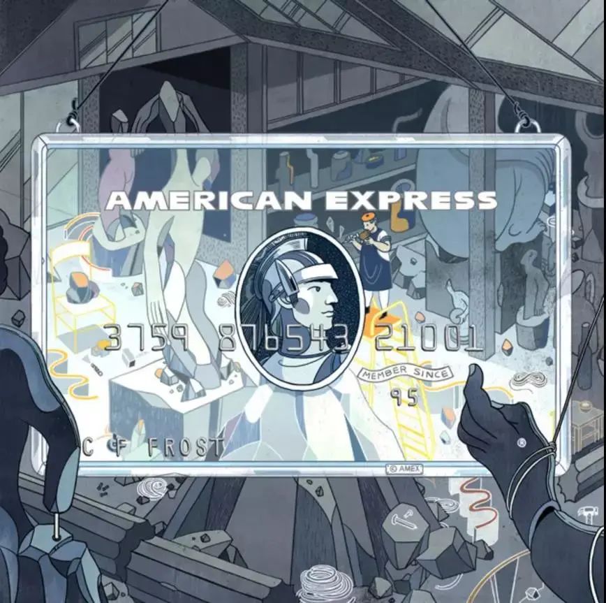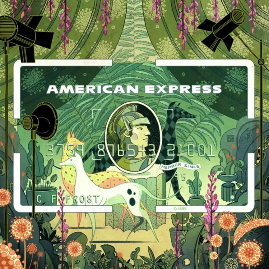 在2015的美国运通卡系列中,倪传婧同样给作品创作了像旅行游记的小故事,而不只是用插画图案去装饰卡片。