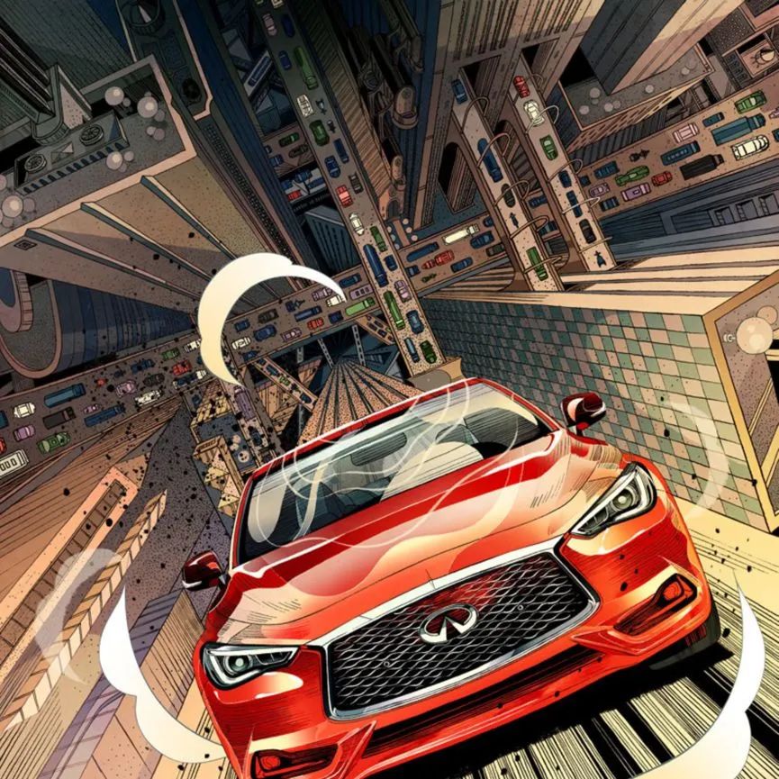 英菲尼迪画中的车型,定位是都市高性能轿车。在画中,车就展现了它卓绝的动力挑战重力和引力的一面,垂直登上高楼,将拥堵的城市道路甩在身后;