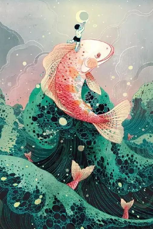 本花很喜欢这一张有国风韵味的图,并且十分惊叹作品顶部的内容:那个天上只露了脸的少女,她钻出或浸入一个水面,惹起了涟漪。