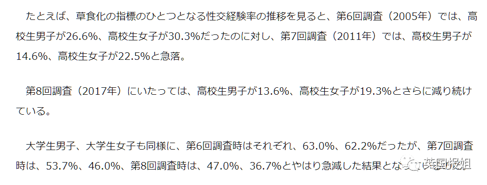 不想恋爱,也不想做爱,高中生/大学生有过性经验的占比逐年下滑。2010年开始,“草食”一词慢慢成为全民皆知的表达方式,似乎比起“肉食”,“草食”才是未来的大势所趋。