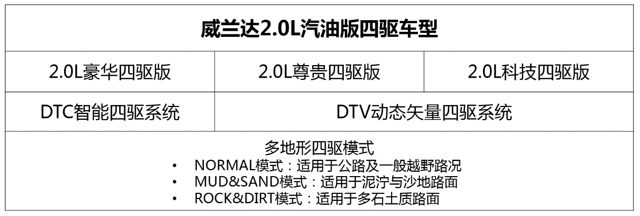 一般的中型SUV,基本只提供一种到两种四驱系统,威兰达罕见地搭载了DTC智能四驱系统、DTV动态矢量四驱系统和E-FOUR电子四驱系统3种四驱系统。其中,2.0L豪华版车型配备了基础的DTC智能四驱系统,更高配置的2.0L尊贵和科技版四驱车型配备了DTV动态矢量四驱,双擎版车型则配备E-FOUR电子四驱系统,给消费者提供了非常丰富的选择,重点是它的价格适中,让消费者再也不用纠结是否“咬咬牙上四驱”的问题了。