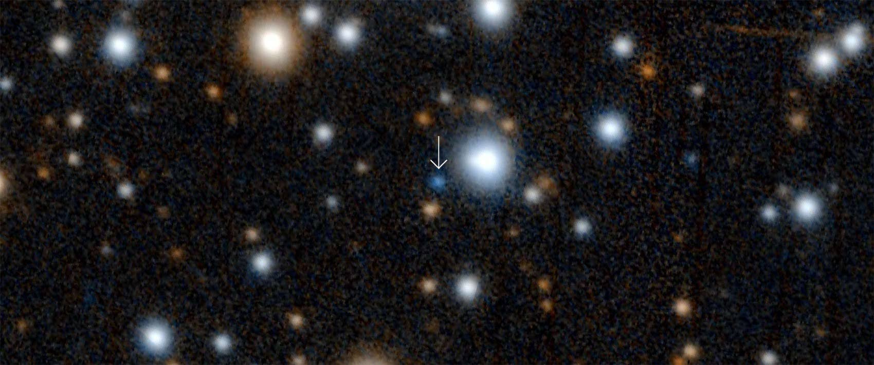 图:白矮星双星ZTF J2243+5242(箭头所示),一对死星,围绕彼此旋转周期运行不到9分钟。资料来源:阿拉丁/泛星计划。