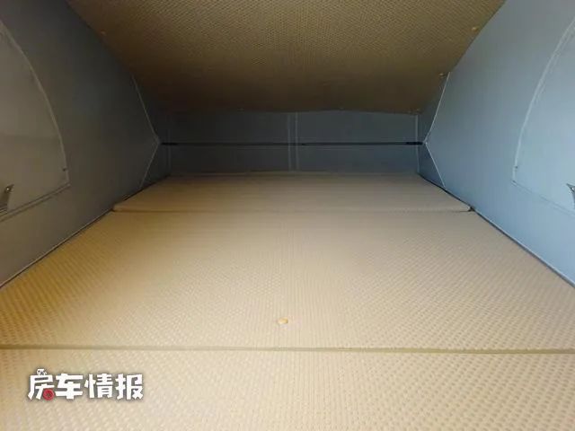 除去拼接的沙发床之外,在升顶区域内也配置了一张可以容纳两个成年人睡觉休息使用的双人床,虽然上方的空间相比下方的空间要更加的密闭,但是床垫更加的平稳,睡起来也更加的舒适。