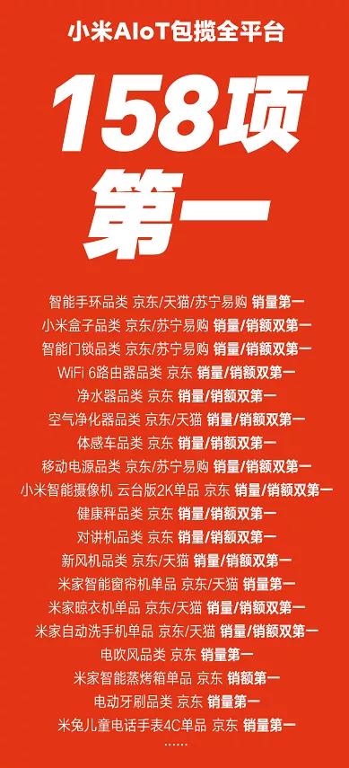此外还有通过风格、操作、设计等多维度创新,将对讲机品类从商用市场普及到发烧友群体,上市5年连续4年拿下京东销量销额双冠军的小米对讲机;独创日出模式功能,618期间斩获京东天猫双平台销量销额双榜首的小米智能窗帘电机;上市以来单品销量超过40万台,今年618同样获得京东天猫双平台双冠军的小米智能晾衣机;首次参与京东618大促就夺得电烤箱品类单品销额第一的小米智能烤箱机......