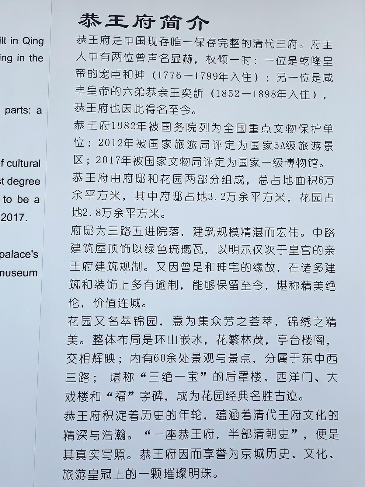 总结,因为面积相对比较大,恭王府可以花一天的时间来走走看看,对比故宫要更轻松一些,还能看到比较独特的建筑,如果有导游介绍的话,可能会收获更多的故事及背后的文化,其中多福轩,里面最贵的是挂墙上的“福寿”因为是皇帝所写的,所以更贵重,还有一个包含完整的康熙大印印章的“福”字碑藏在花园的假山内,没拍到,比较遗憾。