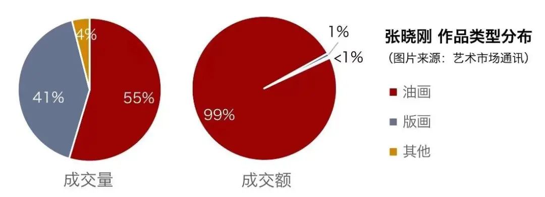 张晓刚低价成交作品以版画为主,占其总成交量的41%,仅次于55%的油画成交量,但成交额贡献不足1%,99%的成交额由油画所贡献。