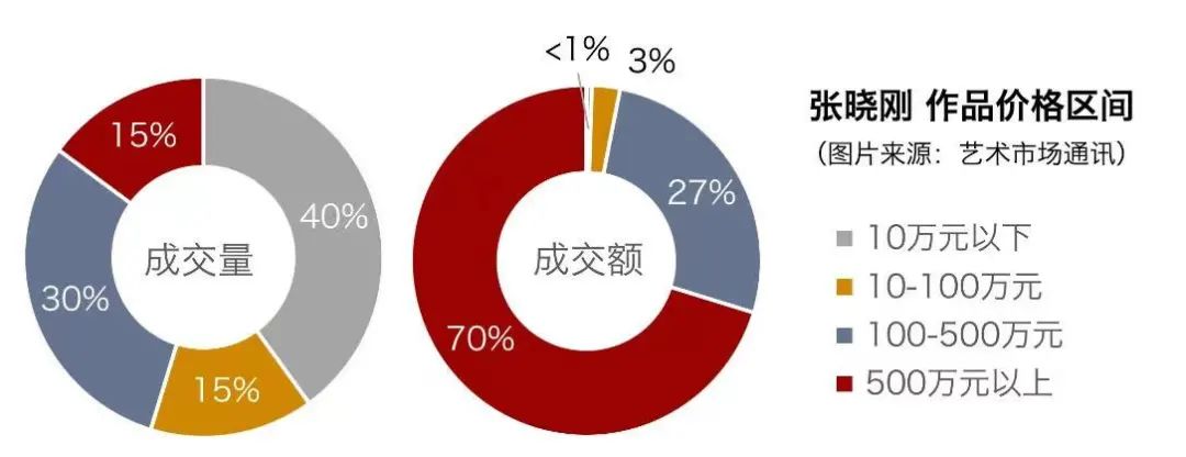 张晓刚的作品价格区间主要集中在10万人民币以下,以及100万-500万人民币,分别占比40%和30%;而对其成交额贡献最大的是500万人民币以上的价格区间,70%的成交额来源于此。
