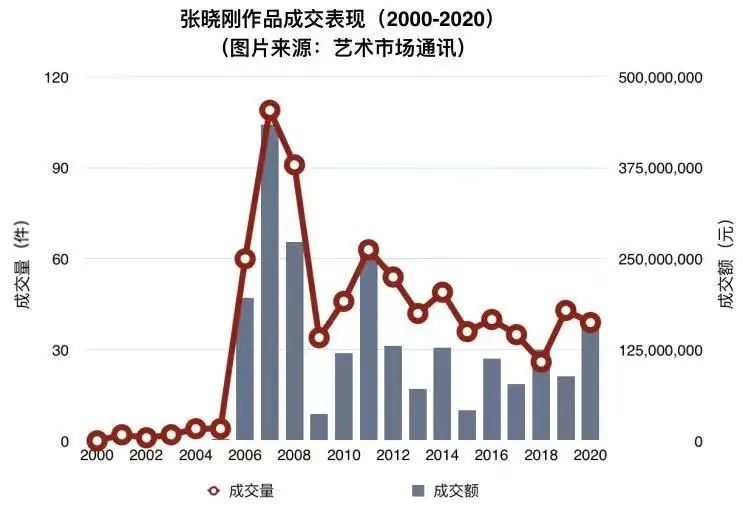 张晓刚作品市场经过多次大起大落,如今进入调整后的稳步上升期。从2006年起,张晓刚的油画市场开始放量上扬,成交额一路飙升,并于2007年达到第一个高点。2008年受金融危机影响,其成交额有所回落,2009年跌至谷底。2010年,张晓刚的作品市场率先反弹并快速上扬,2011年迎来第二个市场高点,但随着中国当代艺术整体进入调整期,以及近几年来势汹汹的全球化浪潮,中国当代艺术和张晓刚的市场份额都被逐渐蚕食,重要作品已进入收藏终端,新作也有待接受市场检验,因此市场再次走跌。近几年,随着中国艺术市场的回暖,以及油画板块的关注加深,张晓刚的作品市场出现稳步上涨趋势。此番上升相对2007年以及2011年的迅猛增量,更显理性。