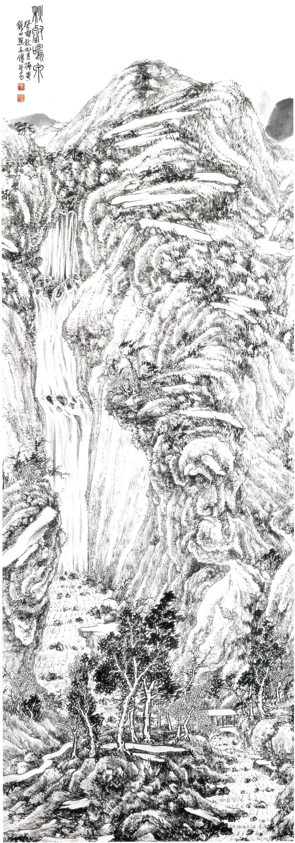 1933年的《仿黄鹤山樵秋壑鸣泉图》,篆书款“秋壑鸣泉”,款识“癸酉秋九月抚黄鹤山樵本,傅抱石。”则是学习“元四家”王蒙的构图和披麻解索皴,重峦叠嶂,繁皴密染,笔墨还是相当见功力的,可以看出傅抱石在山水画方面的天赋,以及他对传统的继承。这时傅抱石30岁,由明清上溯元代,对古代山水画下了一番功夫。1933—1935年傅抱石经徐悲鸿帮助赴日本留学,向日本的美术史学泰斗金原省吾学习美术史,留学期间他1935年曾在东京举办个人画展,作品现在多保存在日本武藏野美术大学图书馆,这时期的山水画是何种风格,目前资料较少,不得而知。