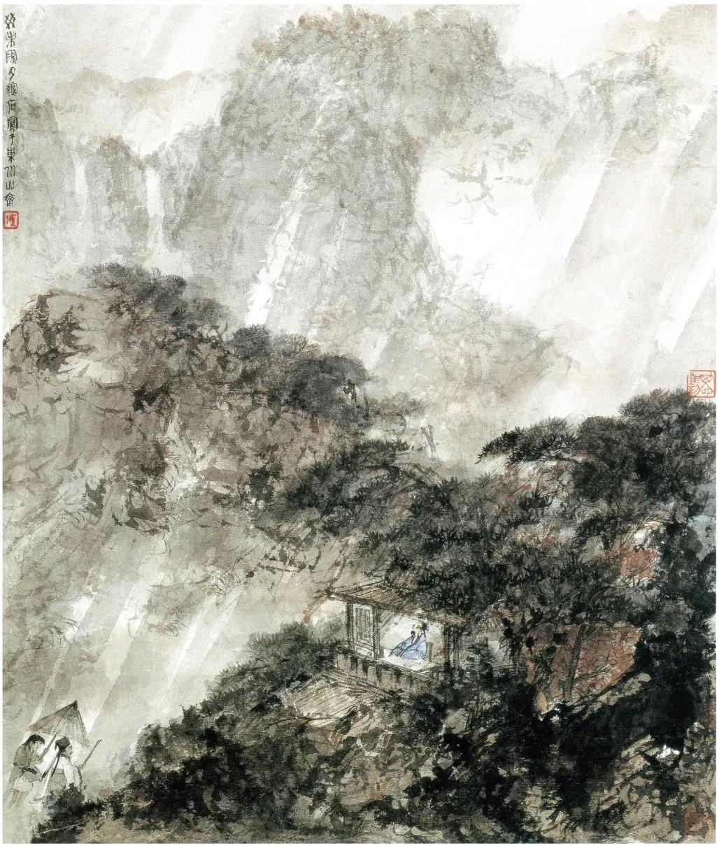 傅抱石一生爱画雨,他画的雨景画非常有气势。在表现雨的手法上,发明了一套自己的技法。古代不少画家都画过雨,米元章、高房山、戴进等,都画过雨。傅抱石的山水画非常重视染法,他曾说:“为了充分表现自然景物的实际变化,晴雨风貌的神韵,应该强调染法的运用。一幅画我常常渲染十数遍,目的就是强化画面气氛和意境。”傅抱石一生画了很多著名的雨景画,如《万竿烟雨》《潇潇暮雨》《山雨欲来》《风雨归牧》《风雨归舟》《巴山夜雨》《嘉陵烟雨》《千峰送雨》《江南春雨》《不辨泉声抑雨声》等。在近百年表现雨景山水上,傅抱石无疑是第一人。
