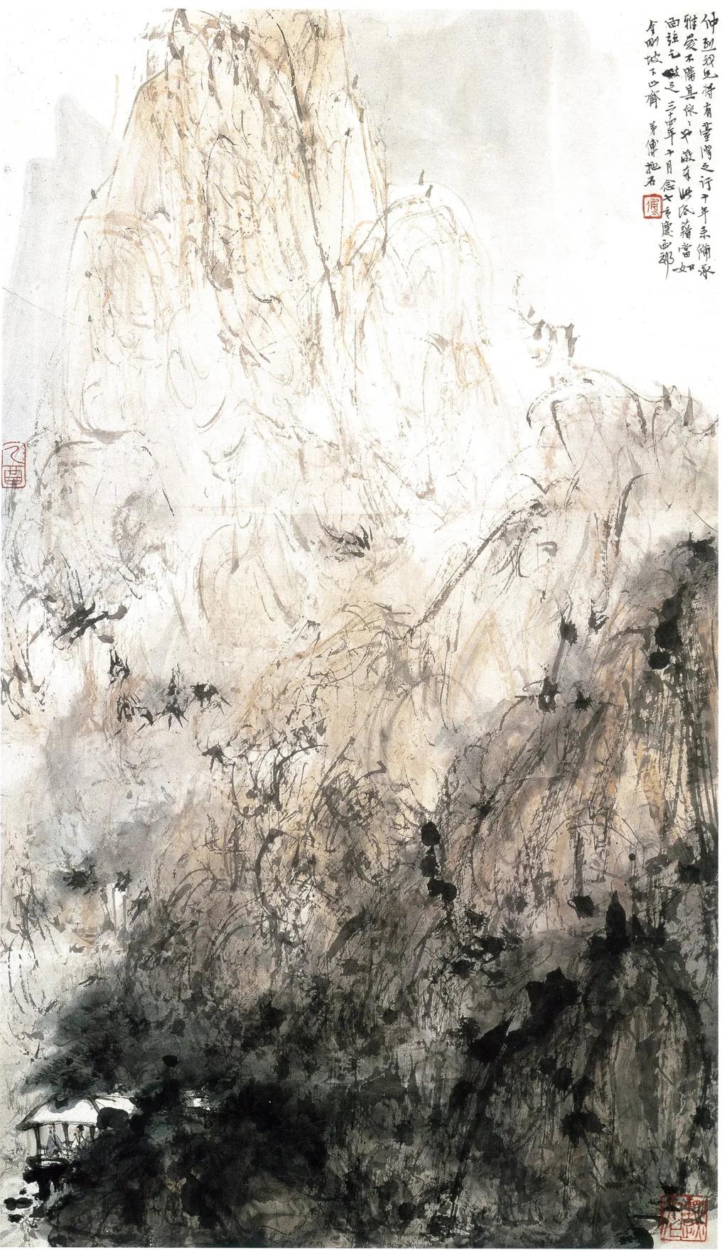 1942—1945年,傅抱石正值40岁左右年富力强,迎来了创作上的高峰,他金刚坡时期的大部分名作,几乎都是这三年里诞生的。如1942年的《大涤草堂图》,1943年的《仿石涛游华阳山图》、《夏山图》、《风雨客至图》,1944年的《万竿烟雨图》、《兰亭图》,1945年的《大涤草堂图》、《水亭话别图》、《潇潇暮雨图》、《山雨》等。这些画,在皴法、墨法上完全出新,其中,《大涤草堂图》,基本没有皴法,完全用墨法去表现,如徐悲鸿所说的“块面”。而《水亭话别图》,则完全用草书去皴山石。