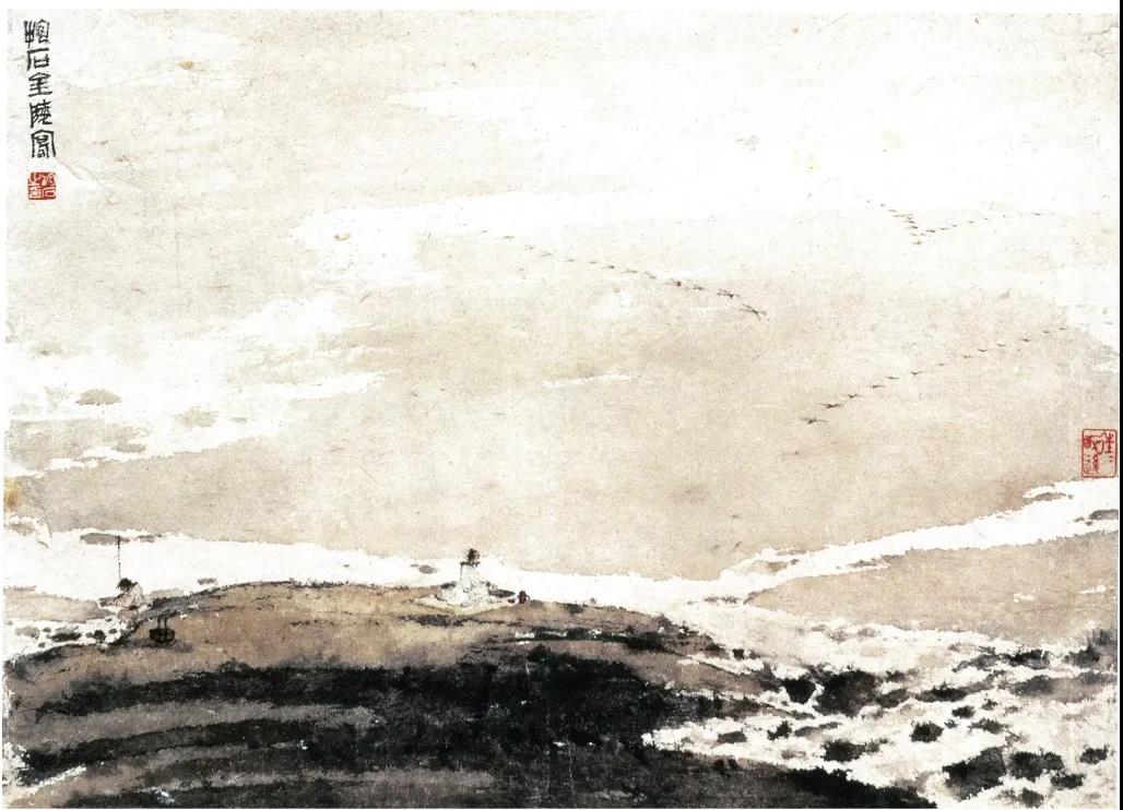 目前可看到傅抱石最早的山水画是20世纪20年代中期的作品,风格比较多变。如1925年的《秋林水阁》(南京博物院藏),款识:“有清山水,乾嘉以前多尚山之深,谷之邃,及龚贤、高西园、吕半隐出,以线条之遒健为宗,于是画风为之稍变,抱石。”这件山水画以焦墨见长,明显有程邃焦墨山水的味道。22岁能画到这个程度,应该说傅抱石还是很有天分的。1925年画的《松崖对饮》,题款:“程邃号江东布衣,画宗北苑,以枯渴之笔成山水,余喜其雄朴而拟之,抱石。”皴法主要是焦墨圆点和弧线,石头的勾皴尽显迅疾,已经可以看出后来“抱石皴”的草意。