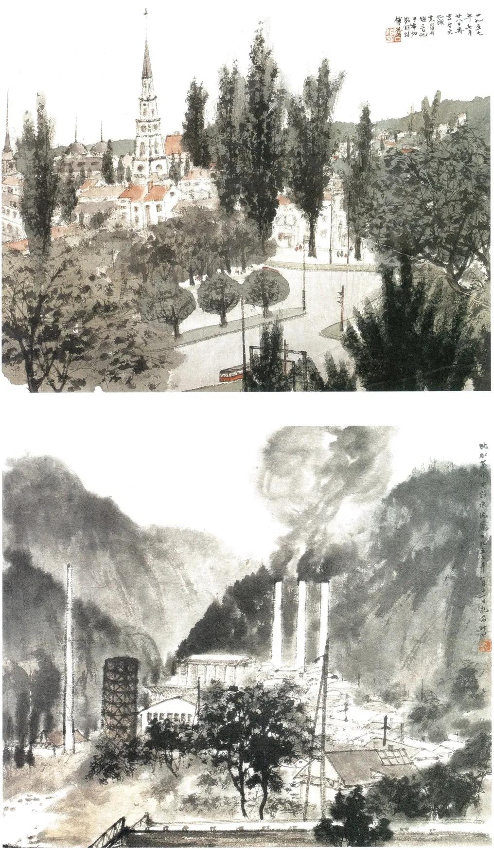 傅抱石 东欧写生 《古文化城克罗什》《比加兹水电站水泥厂》1957年 南京博物院藏