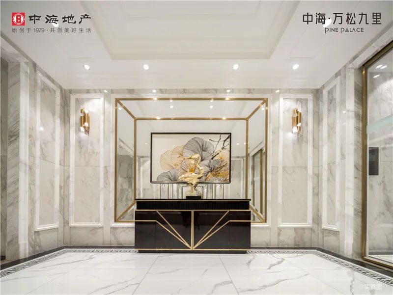 而主人从专梯进入大门,穿过子母门后,第一眼看到的是入户玄关。玄关地板做了“开门见水”设计,选用进口天然石材,由清水玉、爵士白、金世纪、劳伦黑金拼接而成。
