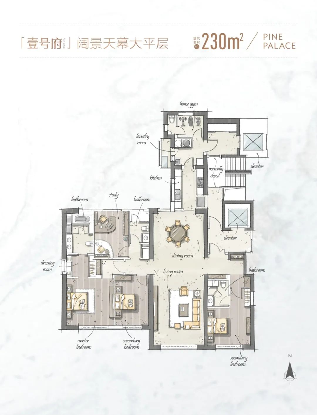 中海万松九里,用两栋超高层和一栋高层,打造了265套大平层,所有住宅只有一种户型,即清一色的230㎡,四室两厅四卫+独立家政间。