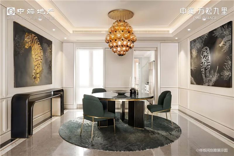 中国人的饮食文化,包含了太多的社交礼仪。中海万松九里为客厅做了约4.8米超大面宽设计,整个餐厅空间50多平米,能够摆放一张12人座的大圆桌,能够满足世族大家的家宴需要。