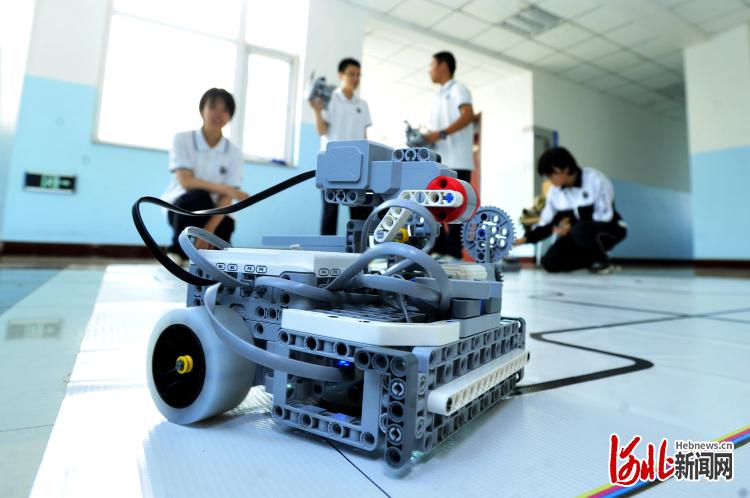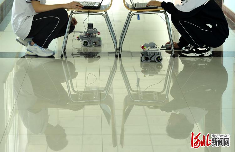 2021年6月25日,在沧州市第一中学机器人实验室,学生们正在场地测试光电循迹无人驾驶模型车。
