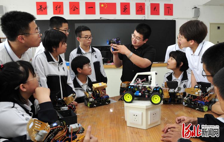 2021年6月25日,在沧州市第一中学机器人实验室,科技老师张振凯为学生们讲解无人驾驶模型车工作原理。