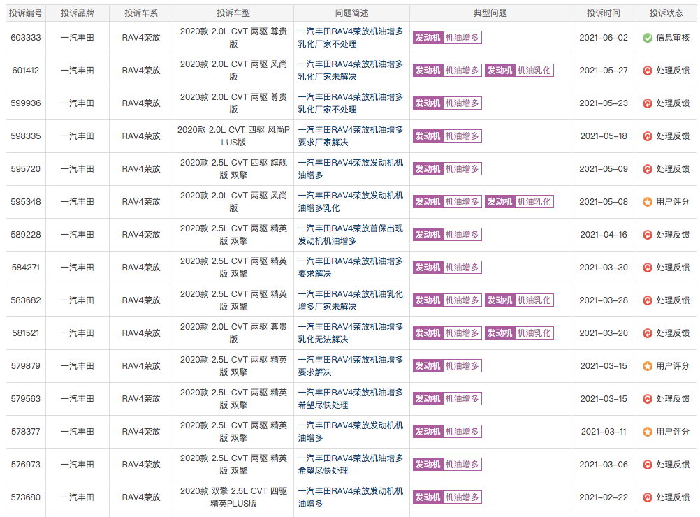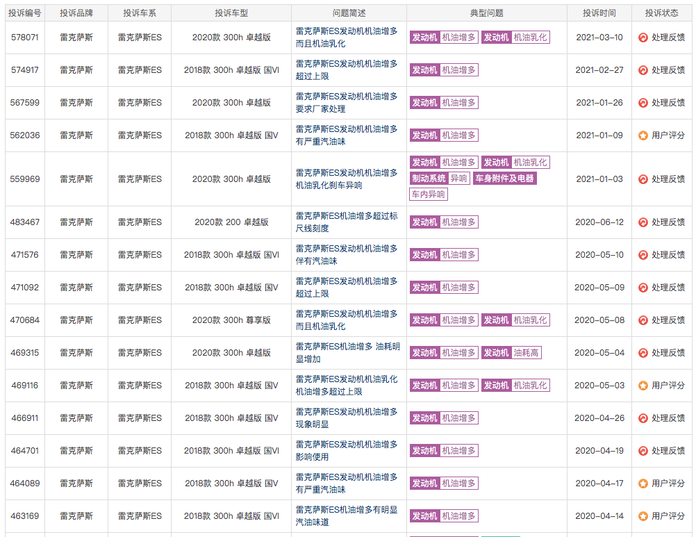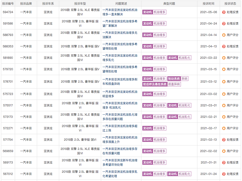 国内丰田车型不同程度的出现机油增多、乳化现象,主要集中在了混动车型上。去年到今年一整年,大量关于丰田RAV4、亚洲龙、雷克萨斯ES、凯美瑞、威兰达混动车主在网络上吐槽,说对丰田失望了,广汽丰田和一汽丰田它们的车型出现了不同程度的机油增多或者乳化现象。关键是出了这么大的问题,丰田中国至今也都没有给出合理解决方式。