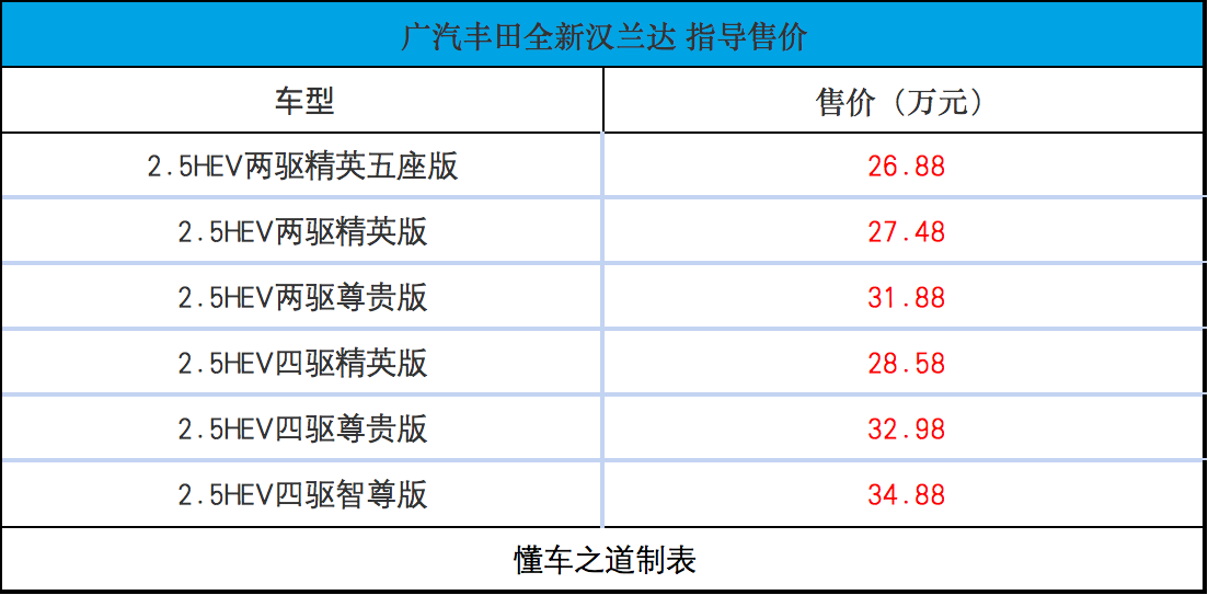 最近新车曝光的非常多,这里面就有很多款重磅车型,其中一款可能大家期待已久的,那就是全新汉兰达。今天,我们从广汽丰田官方获悉,全新汉兰达发布上市,此次提供6款车型可选,售价区间为26.88-34.88万元。