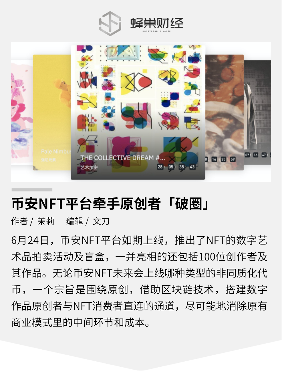 耗时2个月筹划搭建,6月24日,币安NFT平台如期上线,推出了NFT的数字艺术品拍卖活动及盲盒,一并亮相的还包括100位创作者及其作品。